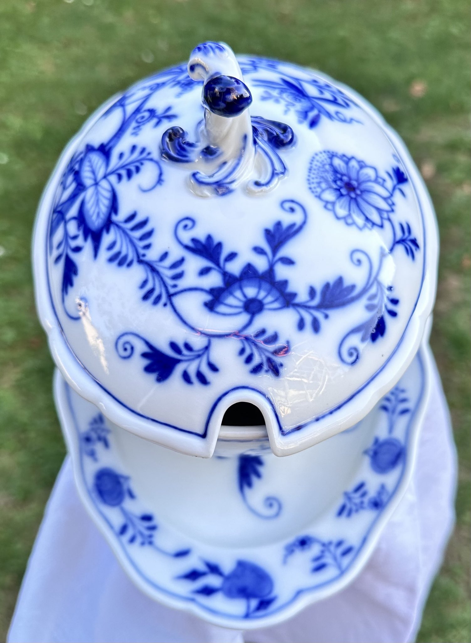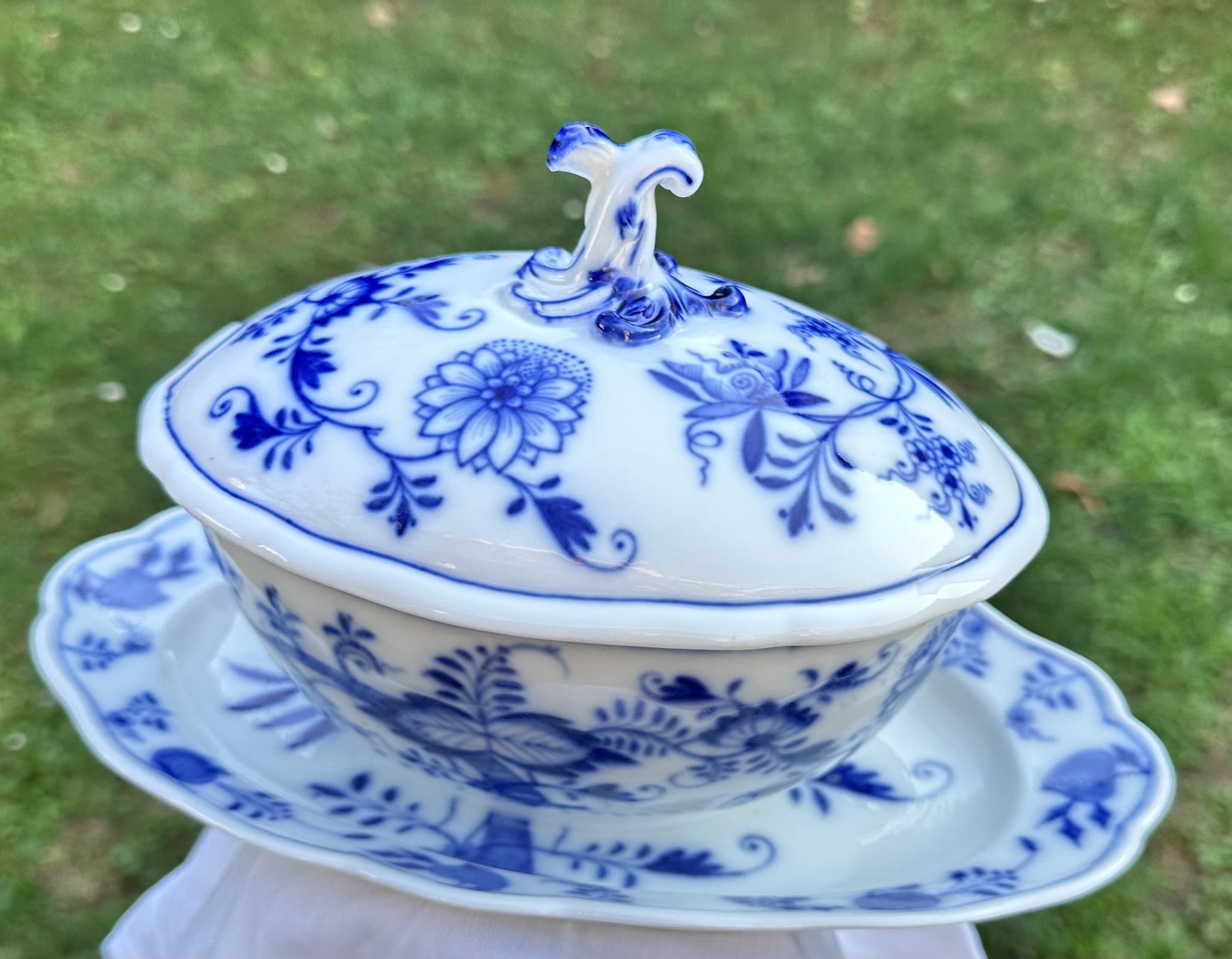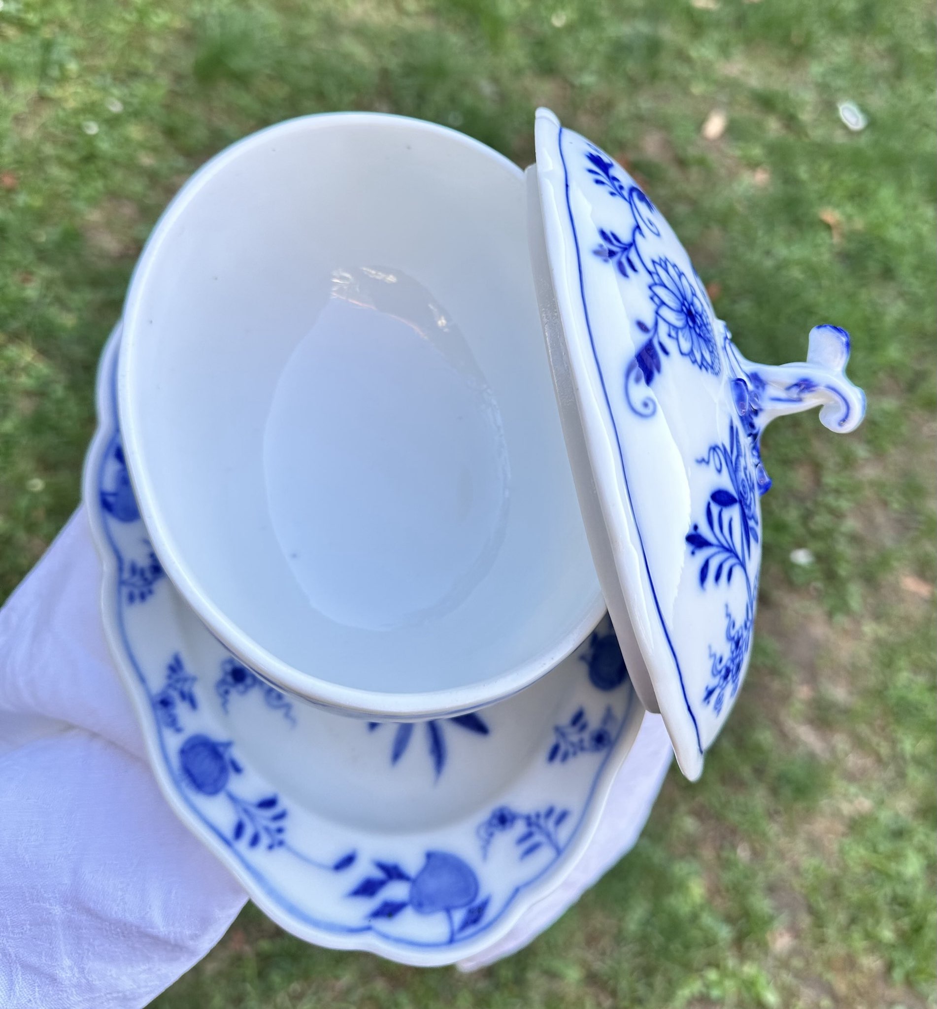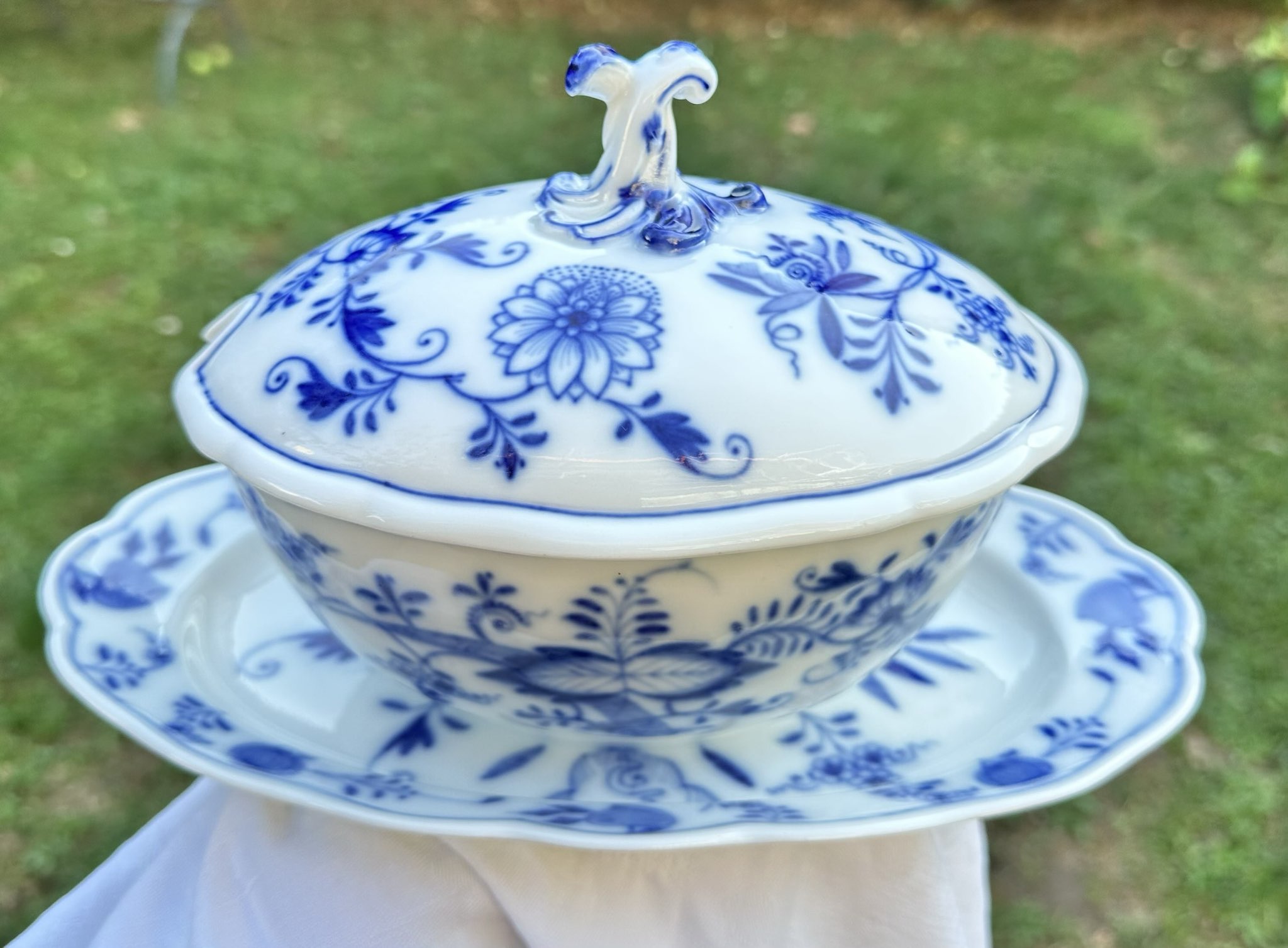 Antike Meissen Porzellan Zwiebelmuster Sauciere Schale mit Deckel und mit fester Unterplatte ca. 1815-1924