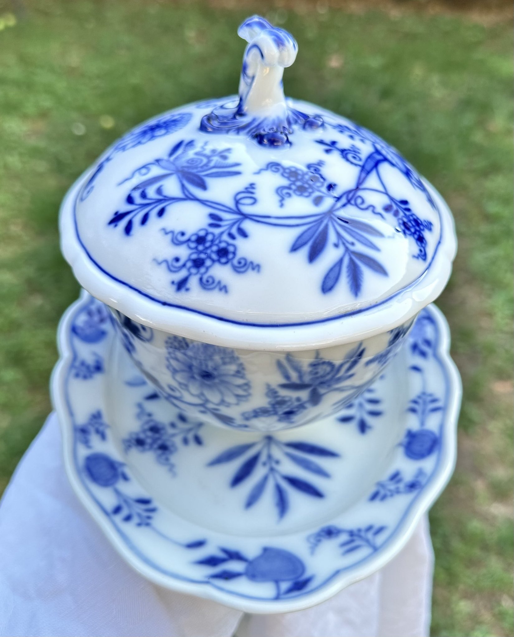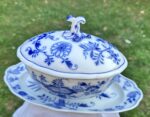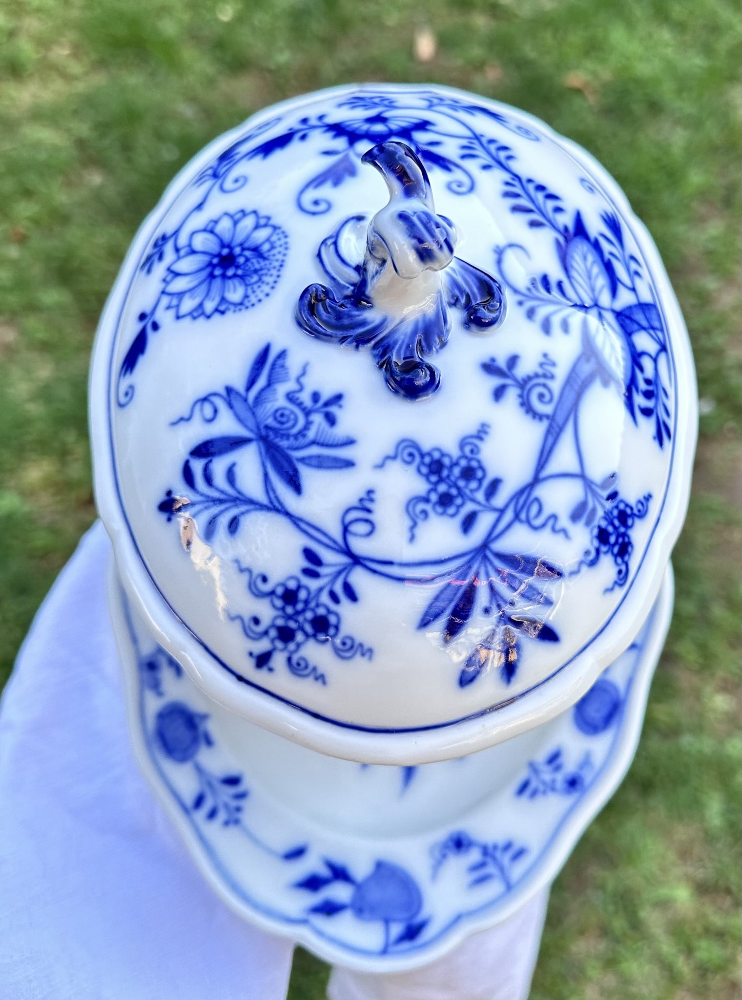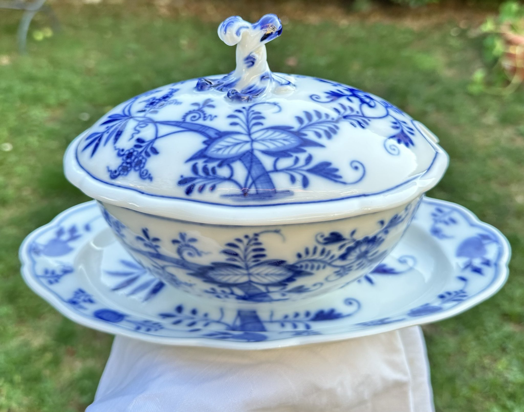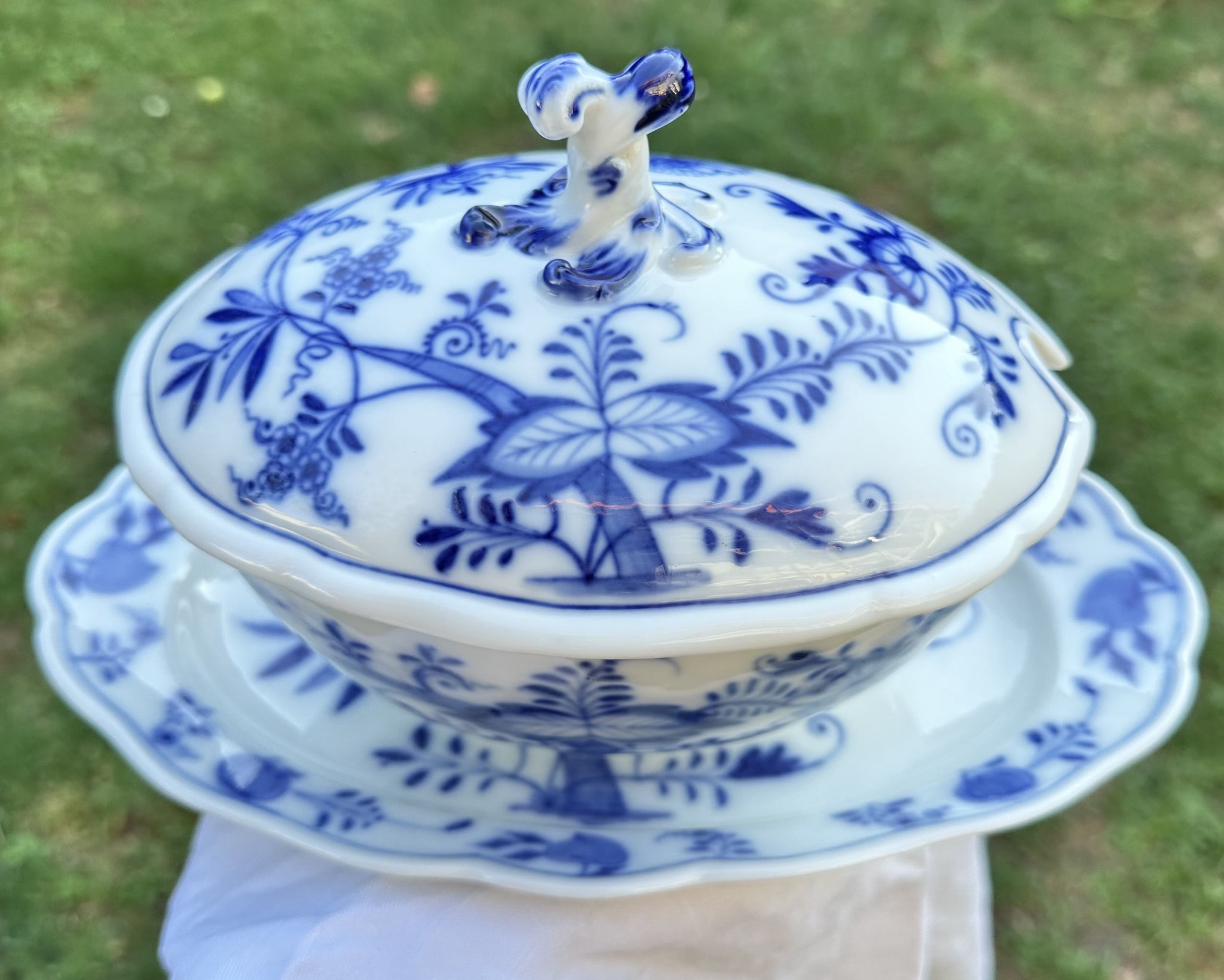 Antike Meissen Porzellan Zwiebelmuster Sauciere Schale mit Deckel und mit fester Unterplatte ca. 1815-1924