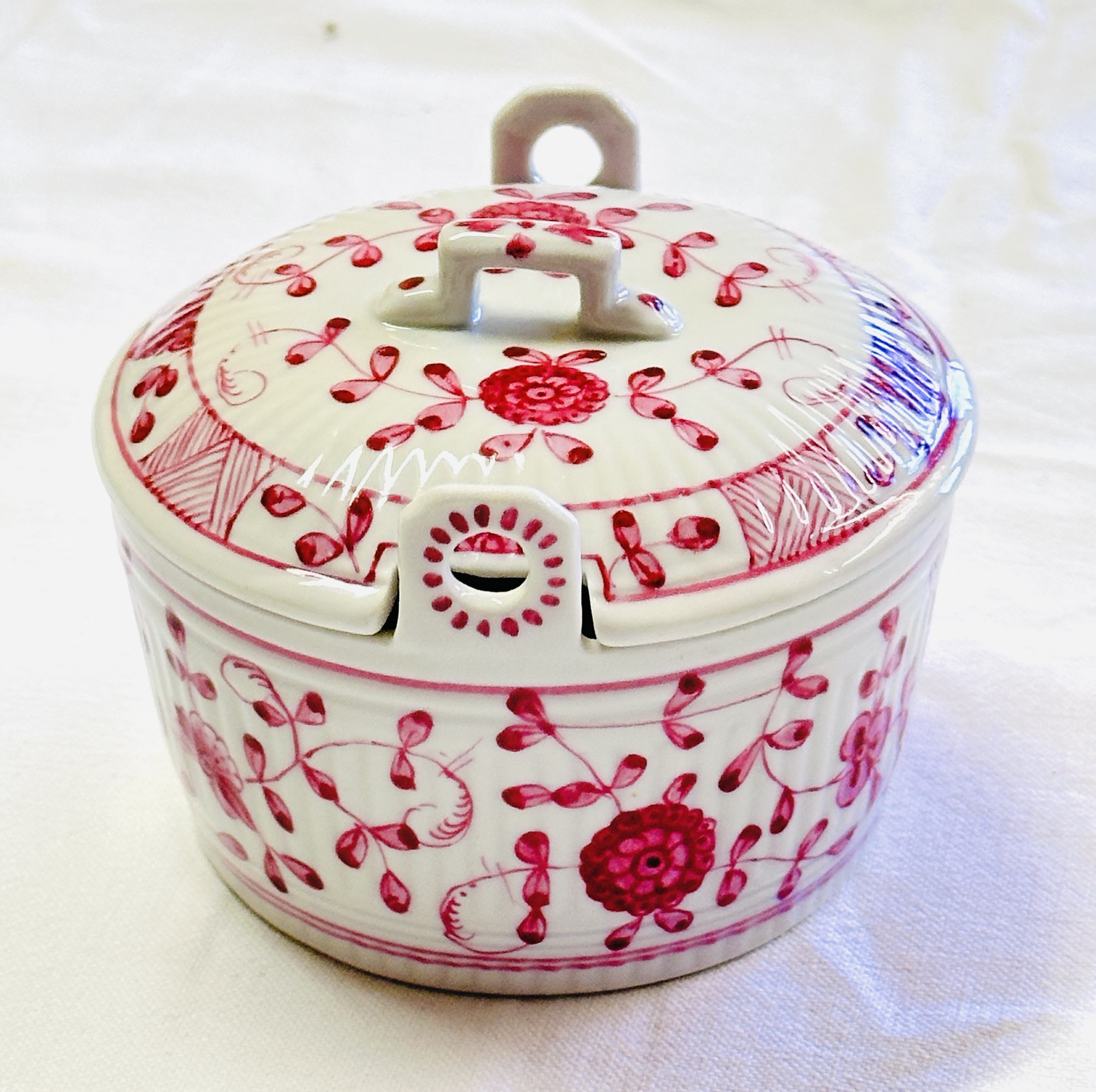 Diese Deckeldose, vermutlich als Zucker- oder Marmeladendose verwendet, besticht durch ihr feines, handbemaltes Purpur-Design „Indian Flowers“. Die Oberfläche zeigt eine dezente Textur, die die zarten Blumenmotive elegant ergänzt. Ein schönes Beispiel für kunstvolles Porzellan um 1900.