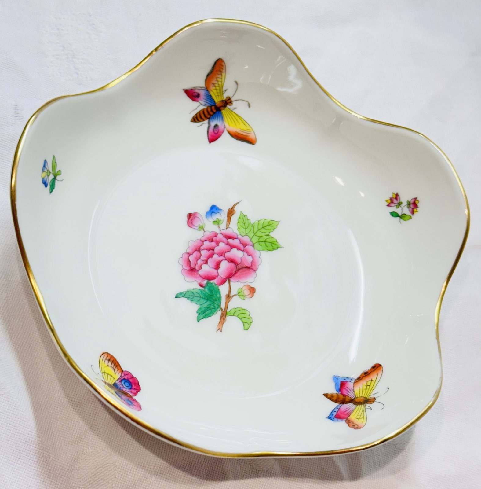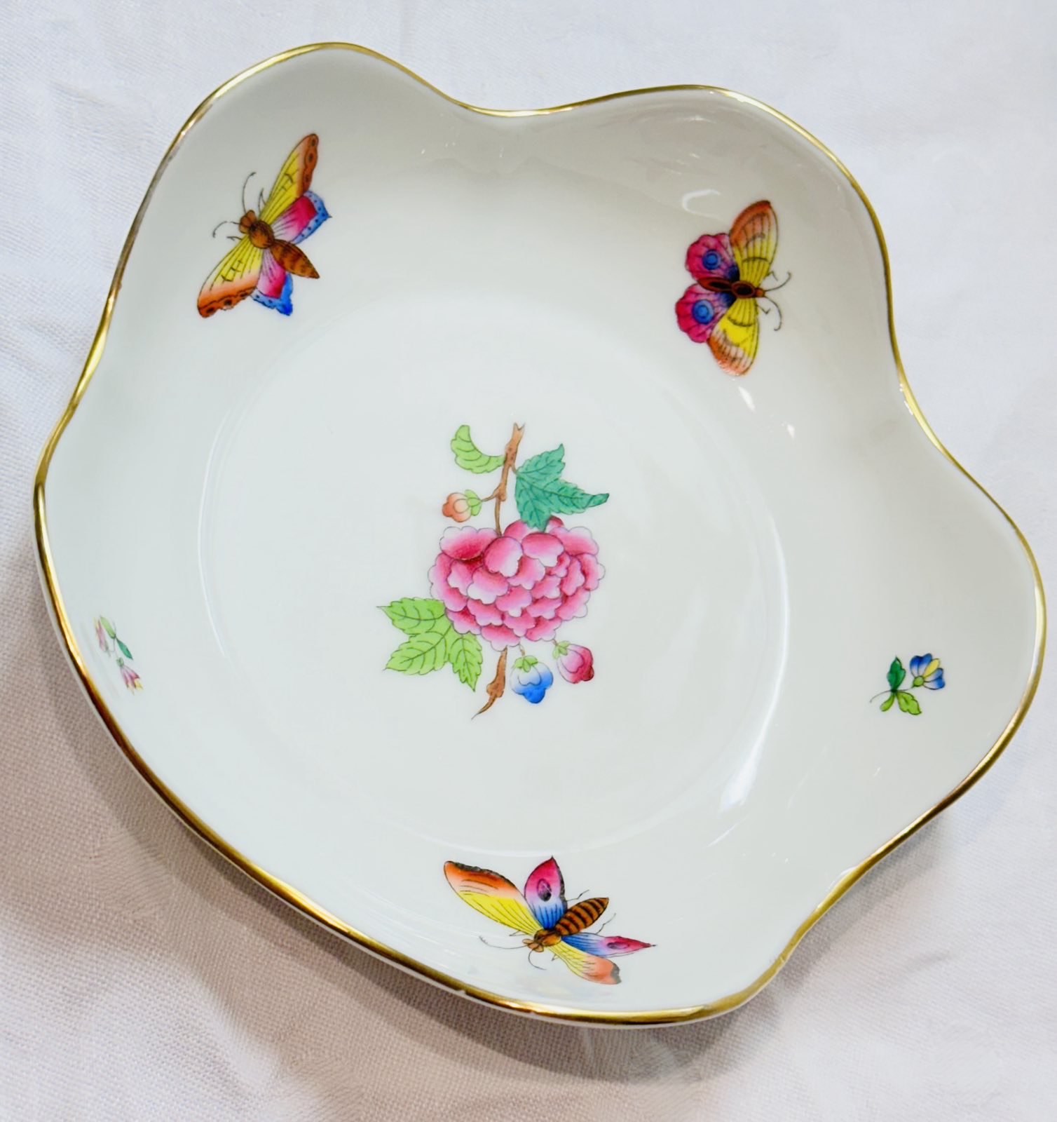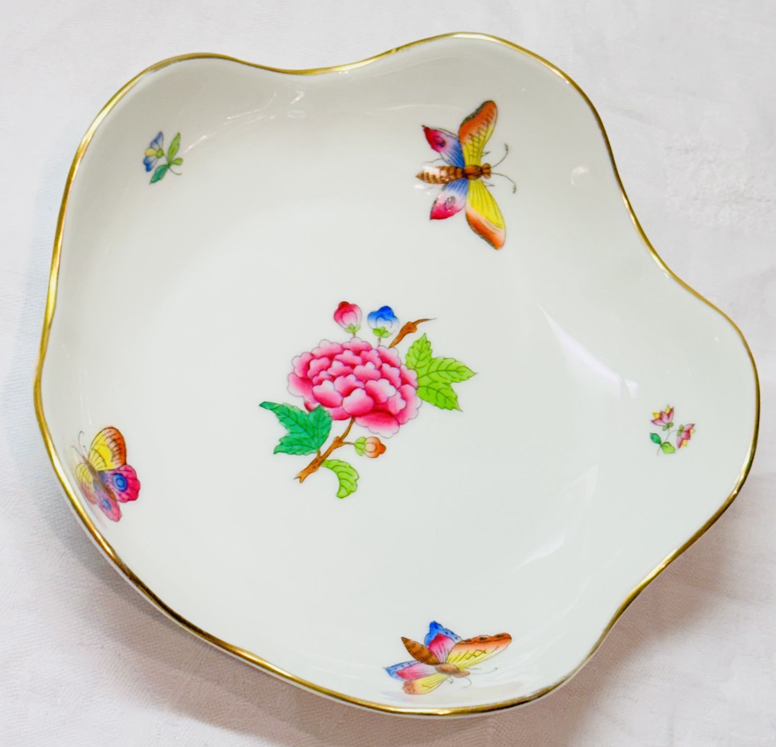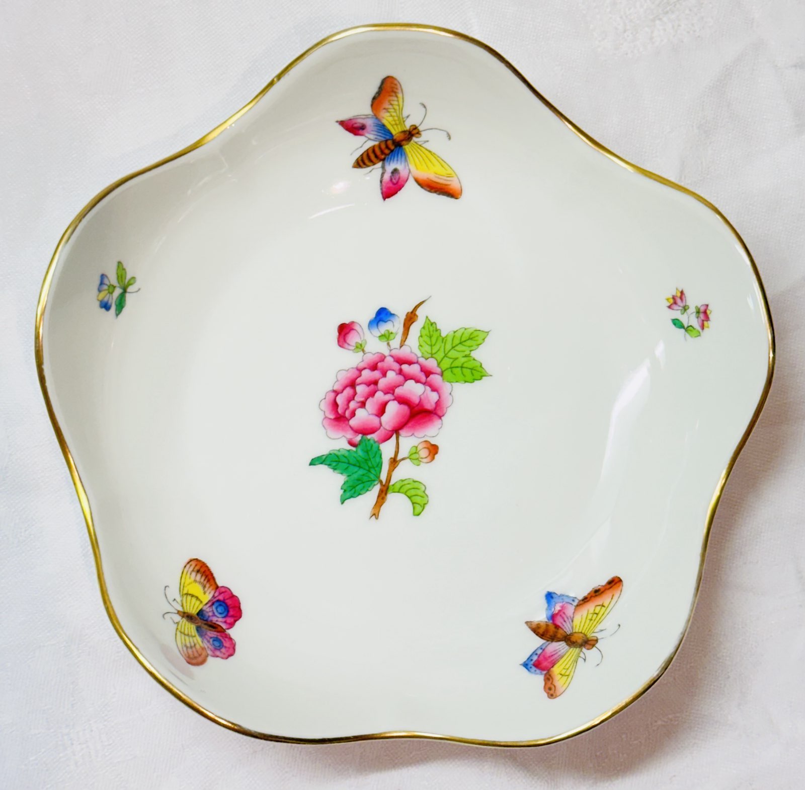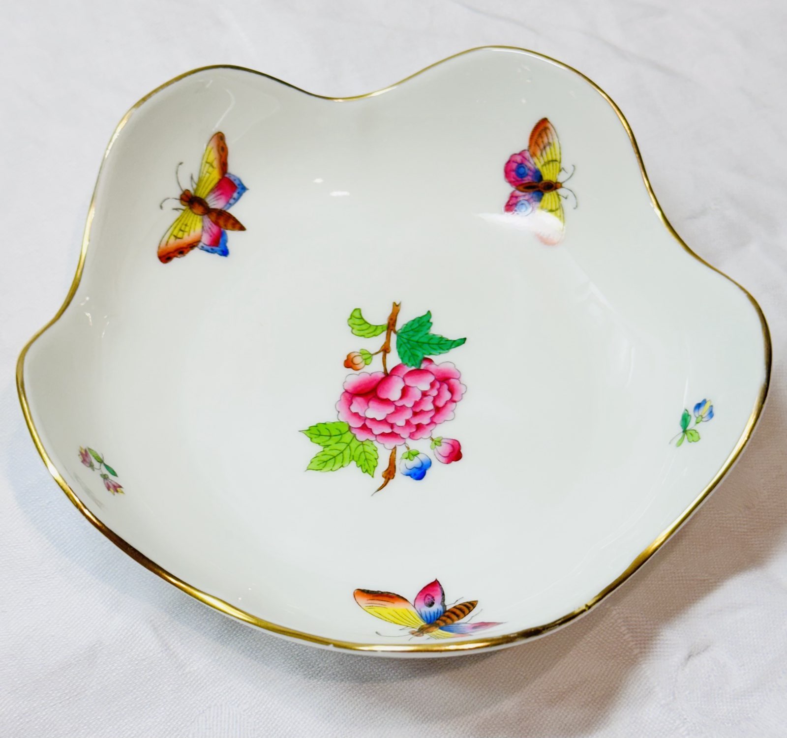Herend Queen Victoria Fünfeckige Schale. Dieses exquisite Stück Porzellan ist bekannt für sein handbemaltes Design und seine reiche Geschichte.