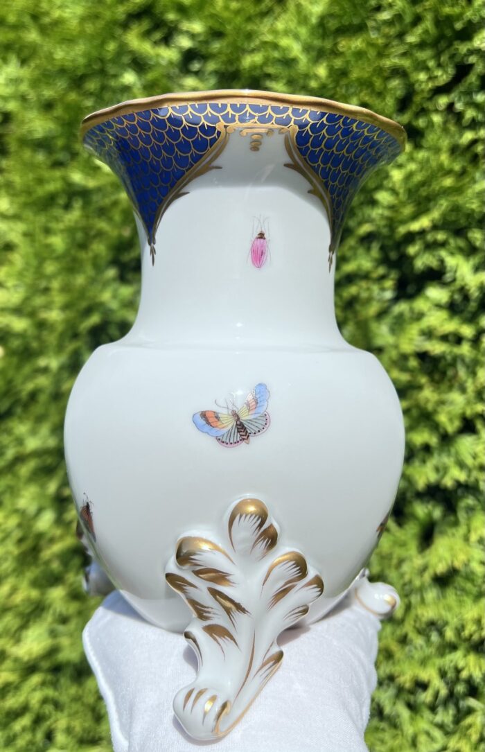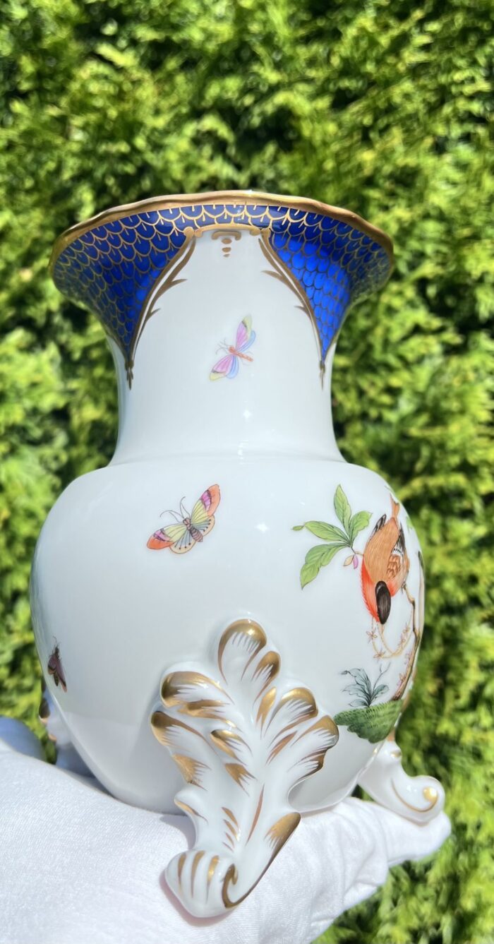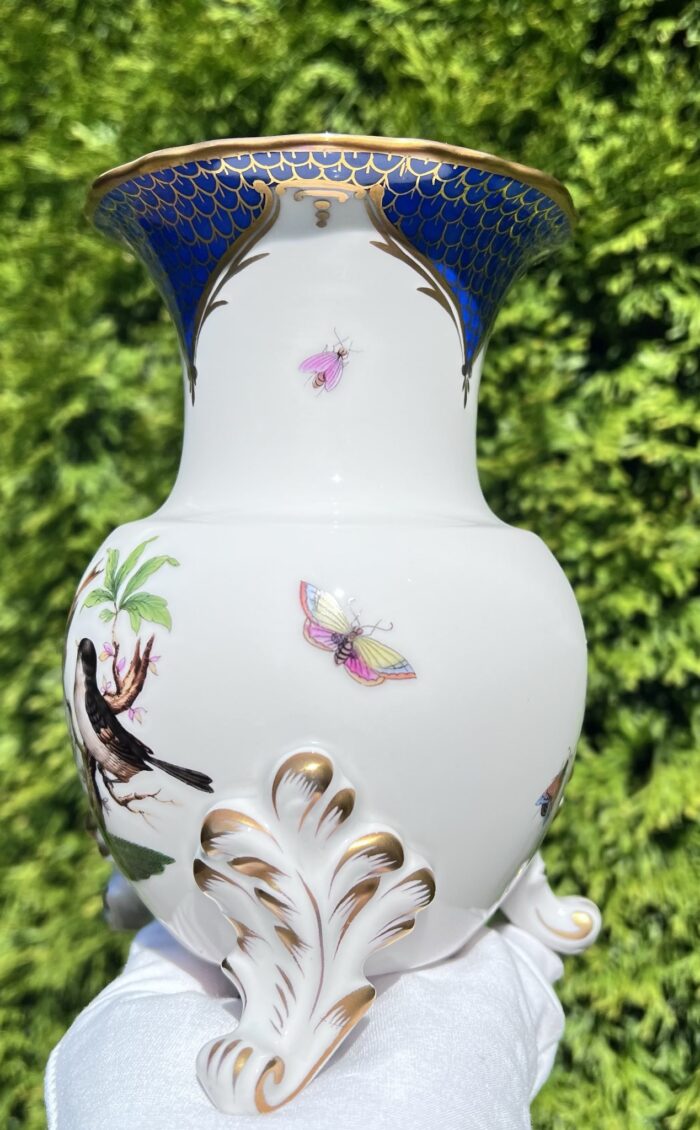 Dies ist eine exquisite Vase aus der „Rothschild“-Serie des Porzellanherstellers Herend, Bemalt im Dekor Rothschild. Das Dekor strahlt Glück und Harmonie aus. Es beschwört die Stimmung des Frühlingserwachens der Natur herauf. Das Dekor ist mit einem naturalistisch und farbenprächtigen zwei Vögel und Schmetterlingen verziert.