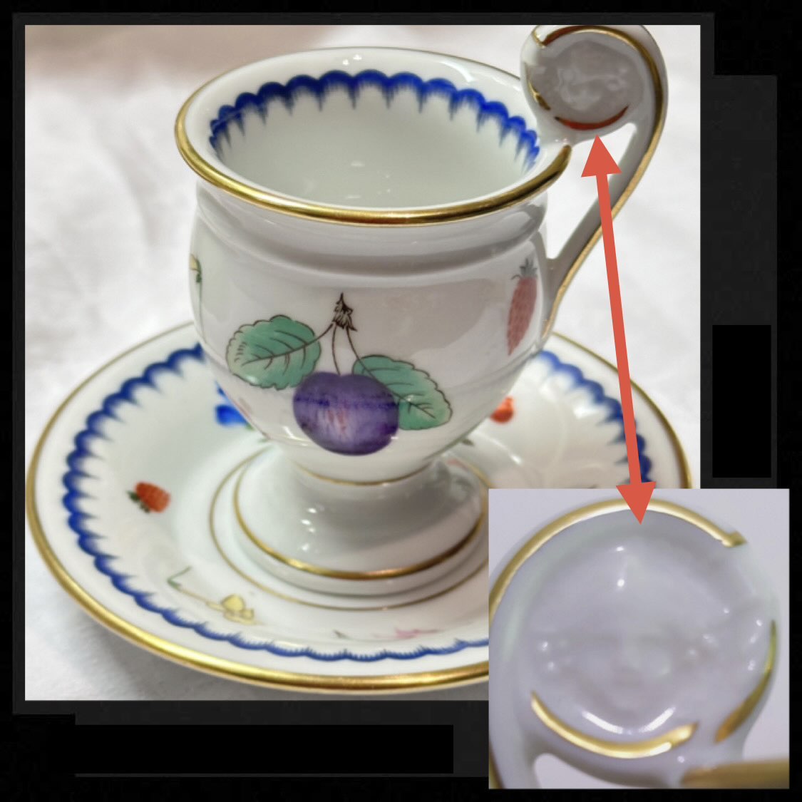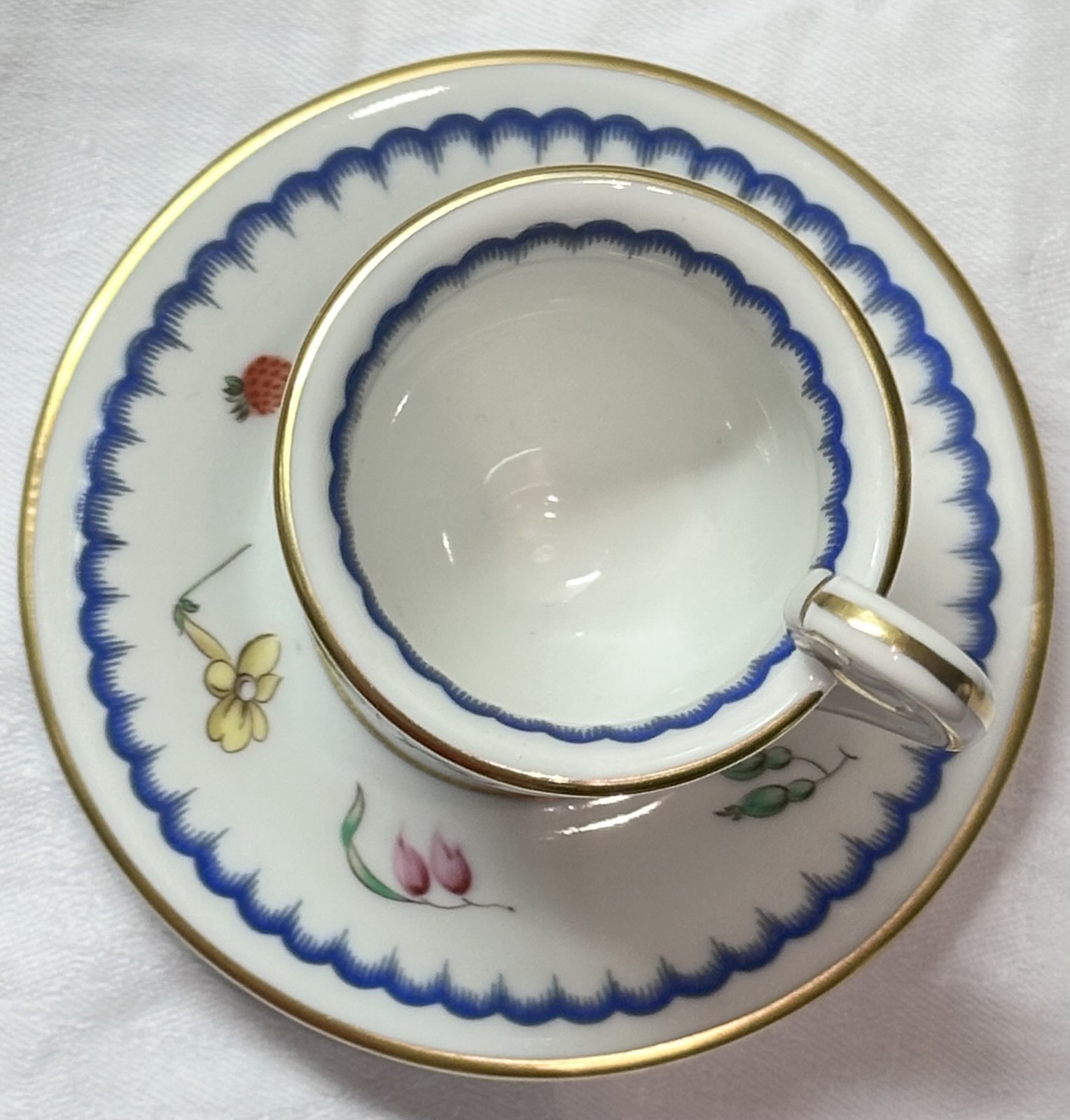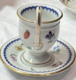 Tasse und Untertasse sind mit verschiedenen farbenfrohe Fruit- und Blumenmotiven bemalt; die Ränder sind mit blauen Ornamenten und goldenen Linien dekoriert.Auf dem Griff sind zwei kleine Engelsgesichter.