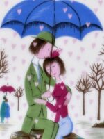 • In diesem Design liegt ganz sicher Liebe in der Luft – die beiden Liebenden stehen unter einem Regenschirm, während rundherum Tropfen in Herzform herabfallen. Das Motiv und die Farben sind einfach zauberhaft.