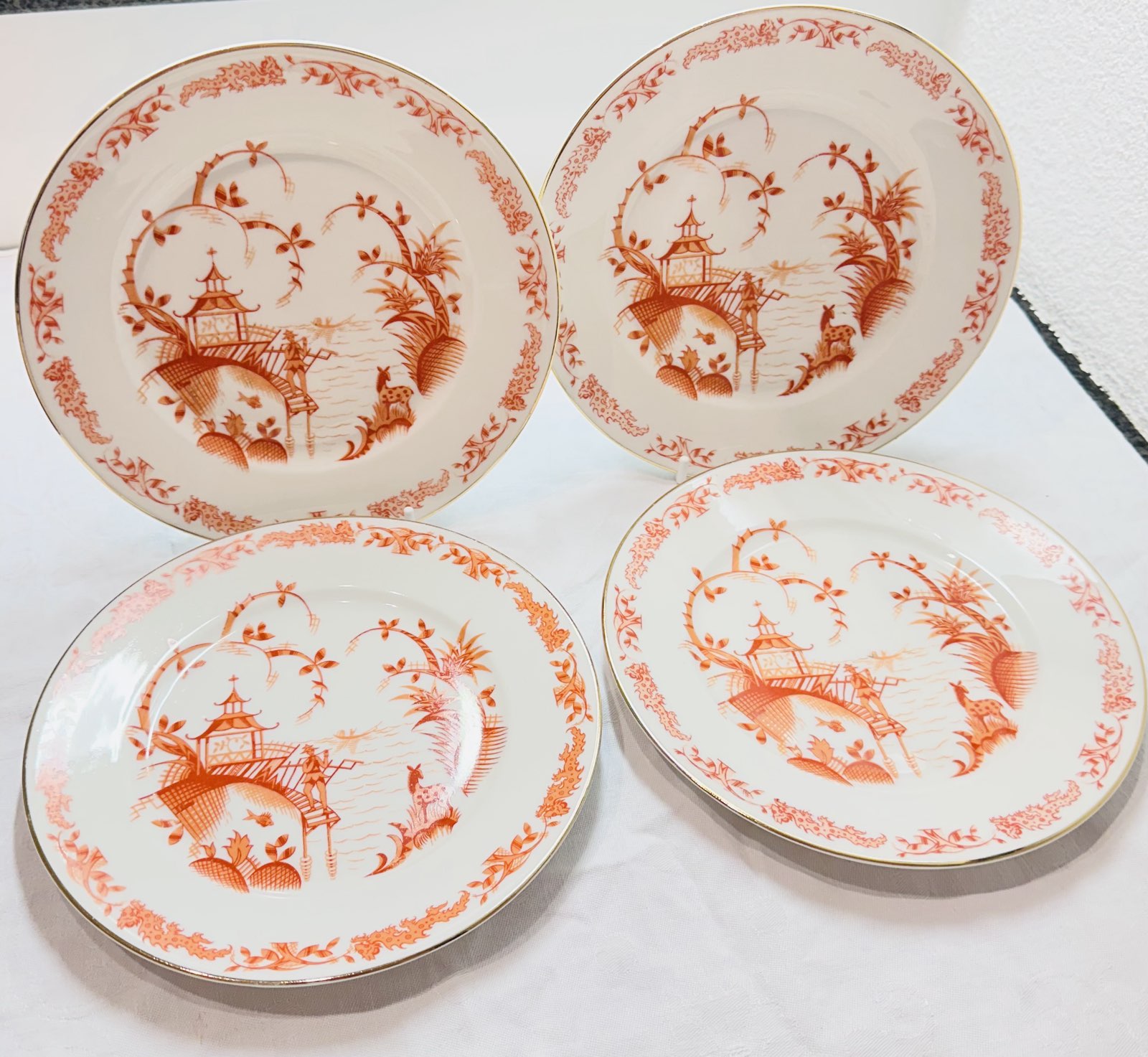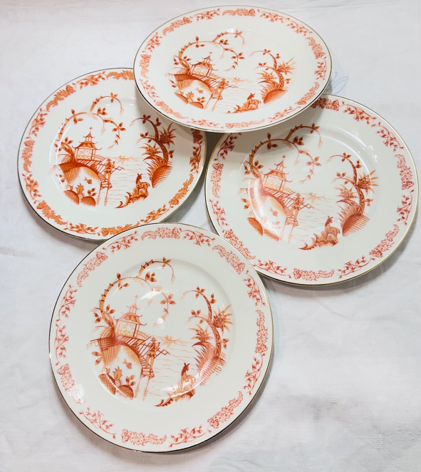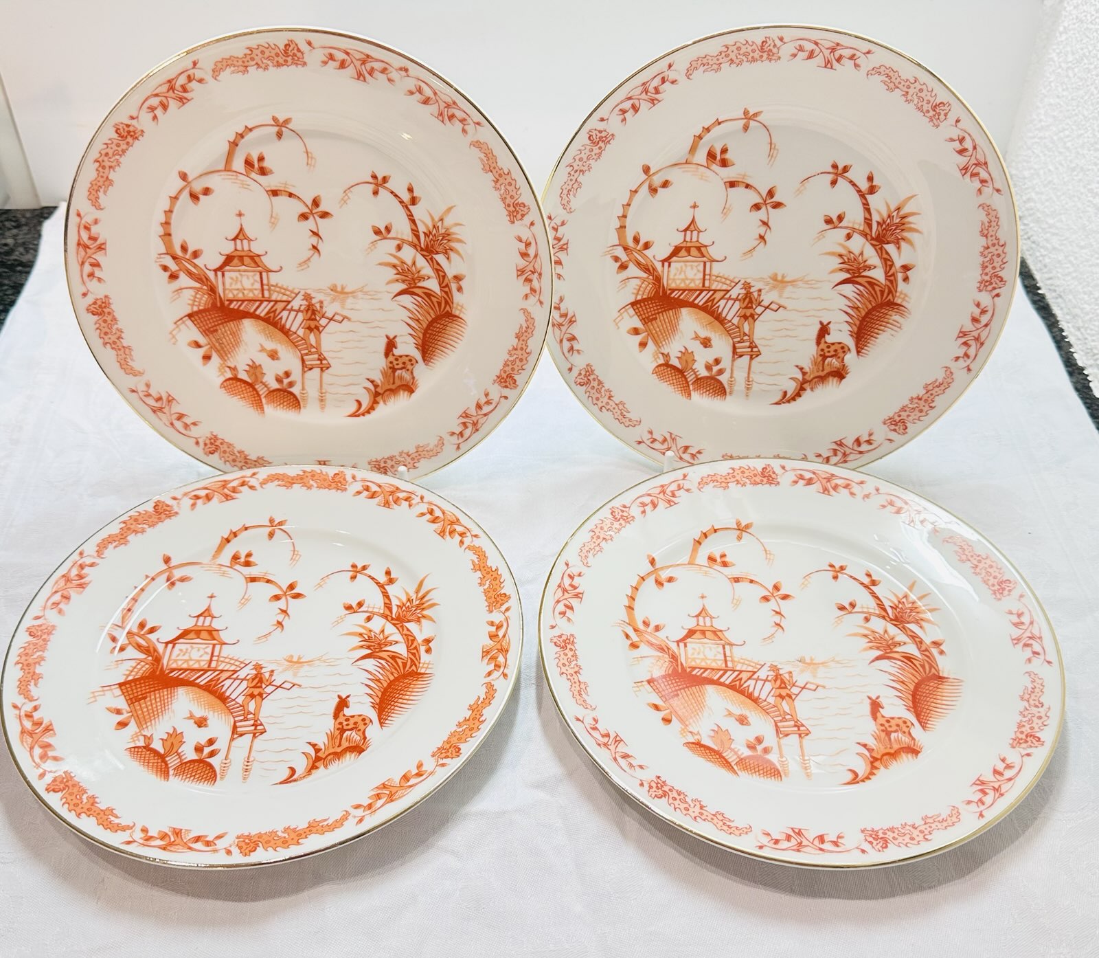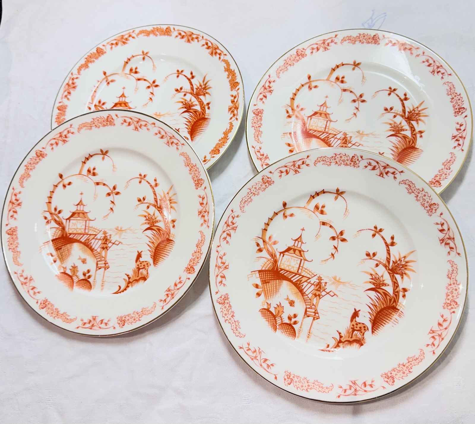 Die Teller sind mit einem fein ausgearbeiteten roten Chinoiserie‑Dekor verziert. Das Motiv zeigt eine idyllische Szene mit Pagode, See, einem Boot mit einer rudernden Person, einem Fisch, einem Hirsch sowie einer Figur, die auf einer Treppe Flöte spielt, ergänzt durch florale Elemente. Der Rand ist mit einem eleganten Golddekor versehen, das den klassischen und dekorativen Charakter der Teller unterstreicht.