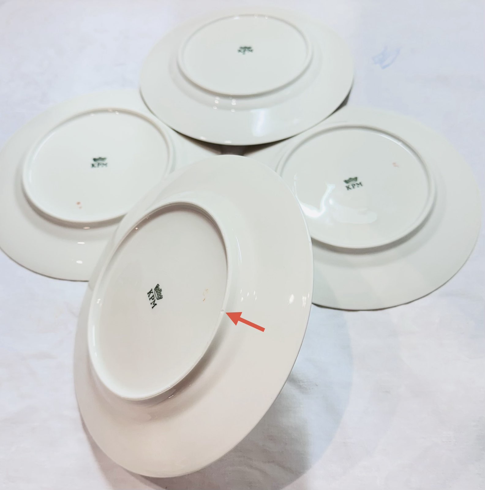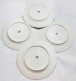 Die Teller befinden sich in sehr gutem, Nahezu keine Gebrauchsspuren, keine sichtbaren Kratzer – insgesamt sehr gepflegter Zustand. Keine Risse, keine Abplatzer, keine Glasurrisse. Der Goldrand ist gut erhalten.An einem Teller befindet sich eine sehr kleine, kaum sichtbare Absplitterung am Fußring (siehe Foto).